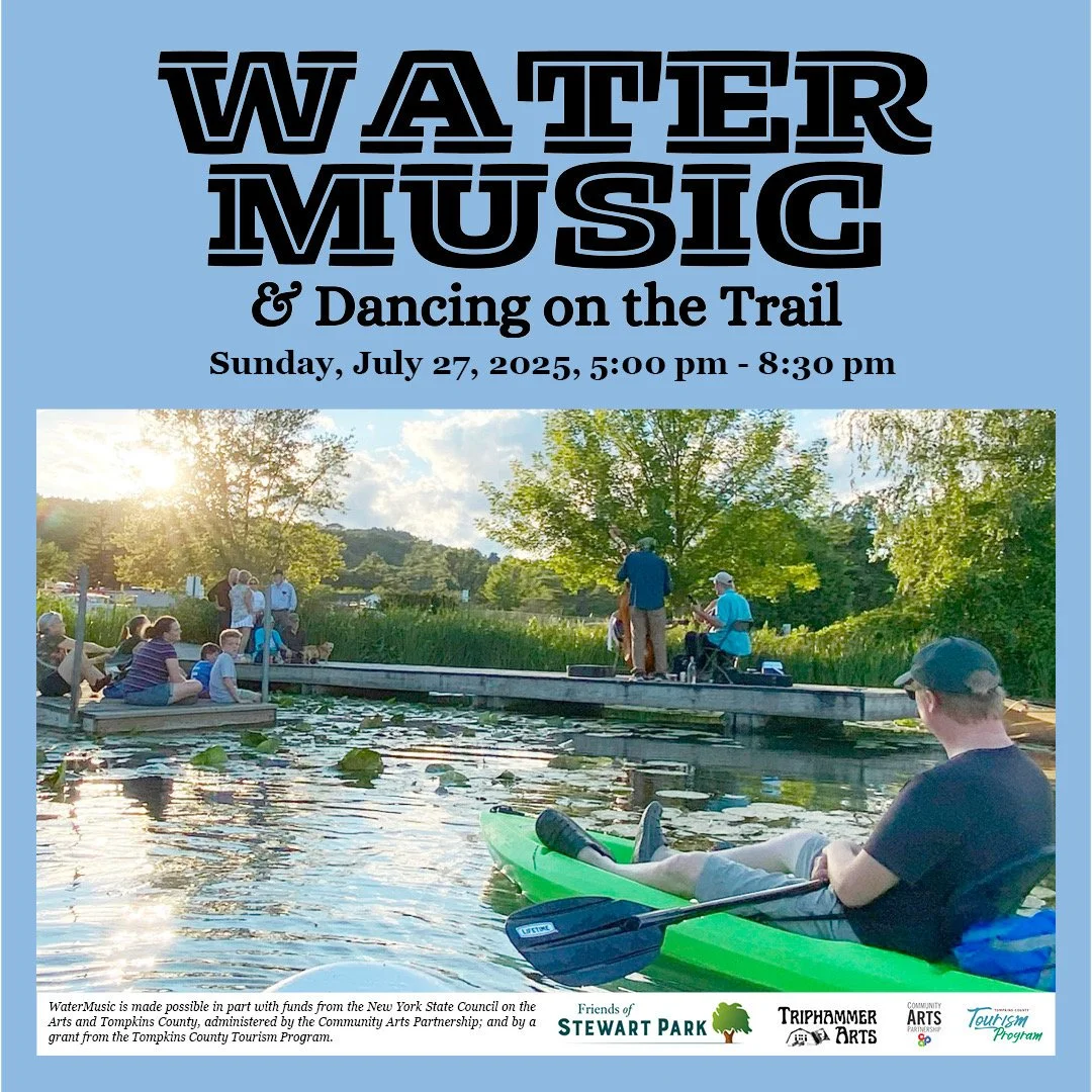Friends of Stewart Park & Triphammer Arts invite you to WaterMusic & Dancing on the Trail, Sunday, July 27, 5:30 pm-8:30 pm.